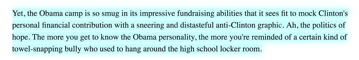 Man, the Obama vs Clinton blog wars in 2008 seem way worse than anything happening today! Here's @TomWatson: "The more you get to know the Obama personality, the more you're reminded of a certain kind of towel-snapping bully who used to hang around the high school locker room."pic.twitter.com/eyjdCr3iG3