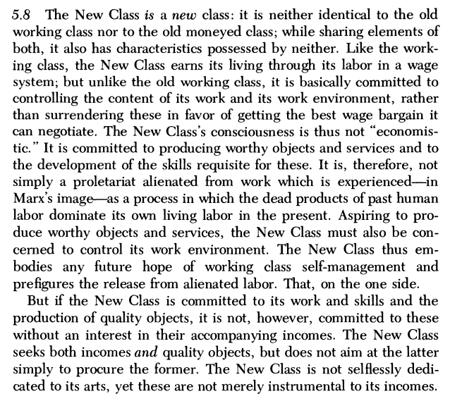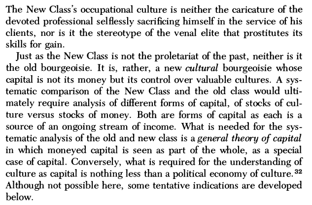 Gouldner draws on earlier New Class theories to explain the PMC in a concrete materialist framework, but one which is dissonant with classical materialist understandings. The PMC are undeniably workers, but they are *bourgeois* workers deriving their income from cultural capital.pic.twitter.com/eNvuanqNcS