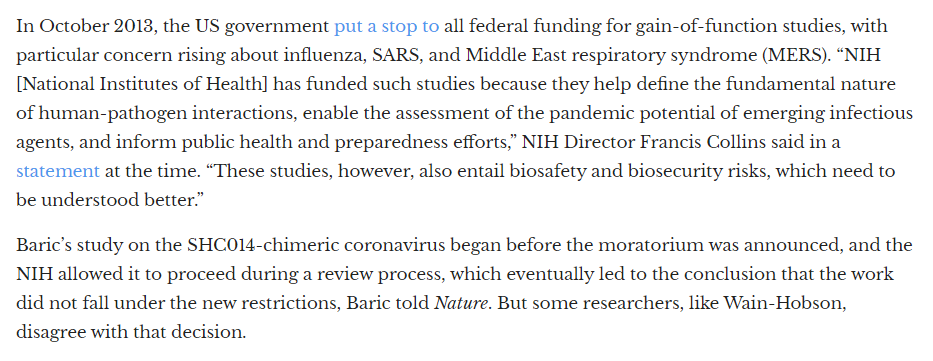 looks like this one got in just under the wire when the US government stopped funding "gain-of-function" research in 2013 https://www.the-scientist.com/news-opinion/lab-made-coronavirus-triggers-debate-34502 …pic.twitter.com/TbCG782gkr