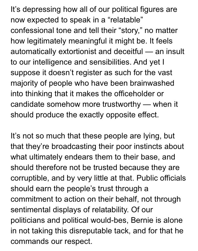 Be that as it may-- the politics of spectacle depend very much on having a "relatable protagonist"-- the body-politick seeking synecdoche in the form of caesarian champion... Bernie lost.