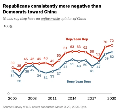 Americans really dislike China, and not just Republicans. 62% of Democrats have an unfavorable view of the country. (The other 38% are on Twitter.)pic.twitter.com/OfgWX91S7y