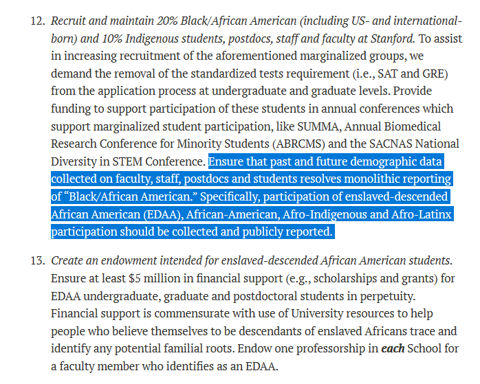 List of demands presented to Stanford includes tracking and reporting the share of black population that is "enslaved-descended African American" (EDDA) and a separate endowment reserved for EDDA. Also calls for end of standardized testing requirement https://www.stanforddaily.com/2020/06/19/letter-to-the-president-provost-of-stanford-university-concerning-a-george-floyd-action-plan/ …pic.twitter.com/5O9nln0D7j