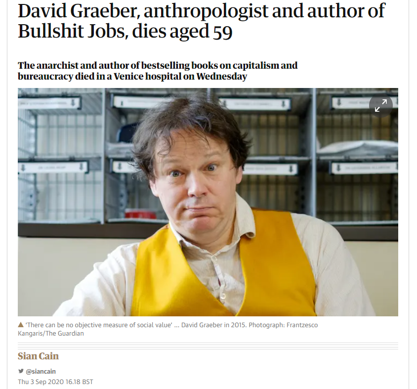 I was suggesting his student occupiers might be outmoded, suggesting other means of technocratic protest and sabotage. An interesting family and academic background. His activism meant he had many political foes and detractors too. https://www.theguardian.com/books/2020/sep/03/david-graeber-anthropologist-and-author-of-bullshit-jobs-dies-aged-59 …pic.twitter.com/DOyShC7J69
