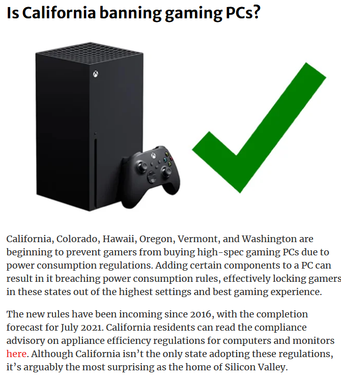 Damn, the regulation is actually specific to PCs. Doesn't seem to apply to consoles, and I don't know how they could prevent people from building their own. Applies to "desktops, all-in-ones and mobile gaming systems." Big Console is playing dirtyhttps://www.pcgamer.com/dell-is-cancelling-alienware-gaming-pc-shipments-to-several-us-states/ …