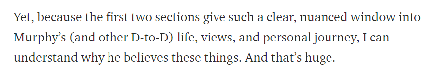 I earned Holly's trust by the end of the book and that allowed me to make arguments she didn't agree with, but she didn't dismiss the whole thing out of hand either. This was the empathy I expected from my friends and family but never received. Kudos to holly for her maturity.