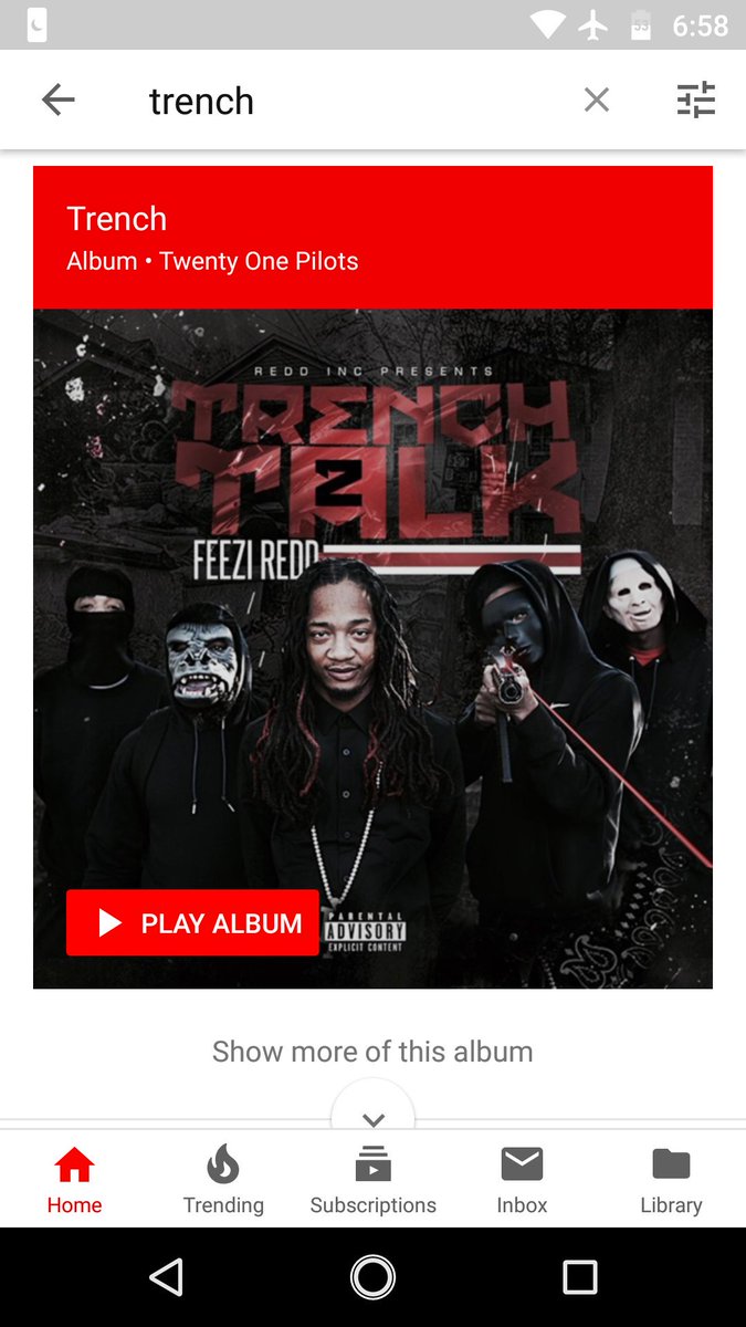 @TeamYouTube Why is Feezi Redd showing up when I search for Trench by @twentyonepilots? It's happening on Desktop and the YouTube app.pic.twitter.com/CqEyFkLmtn
