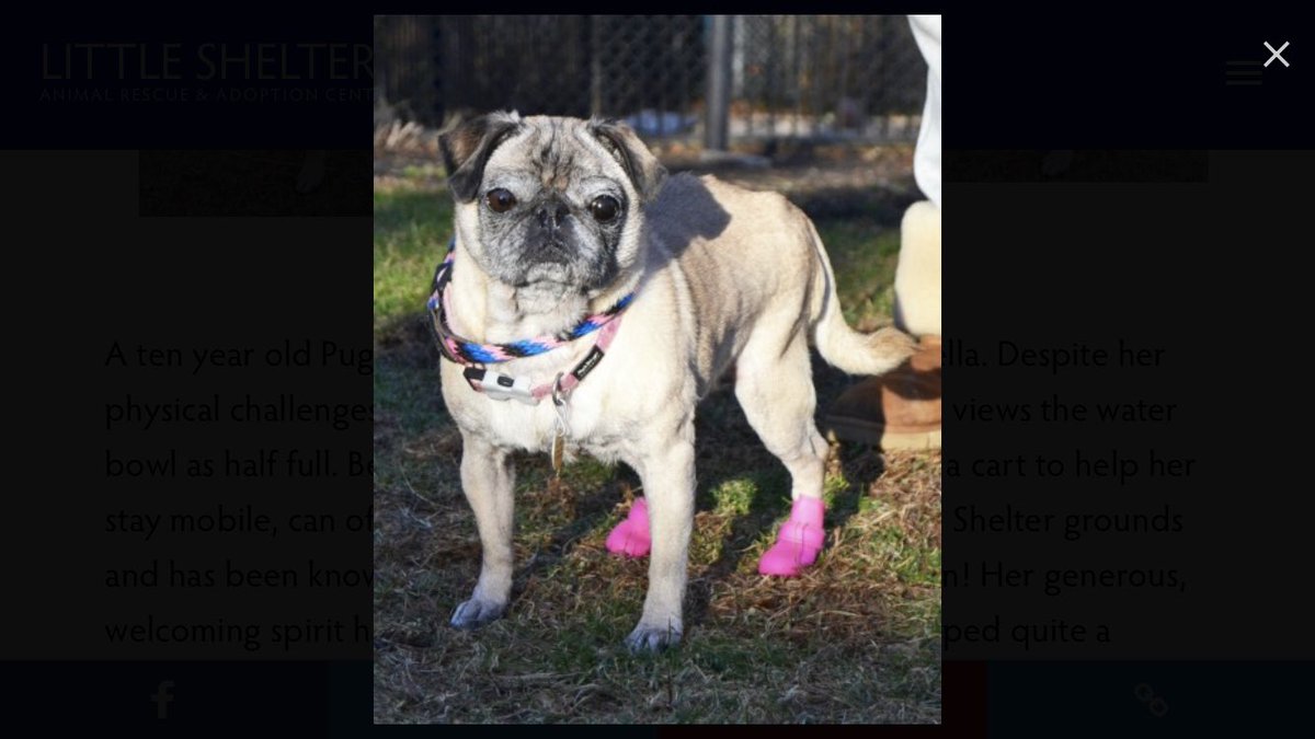 A ten year old Pug, this beauty is appropriately named Bella. Despite her physical challenges, she is always positive and upbeat and views the water bowl as half full. Because her back legs are weak, she uses a cart to help her stay mobile, info 631-368-8770 x21