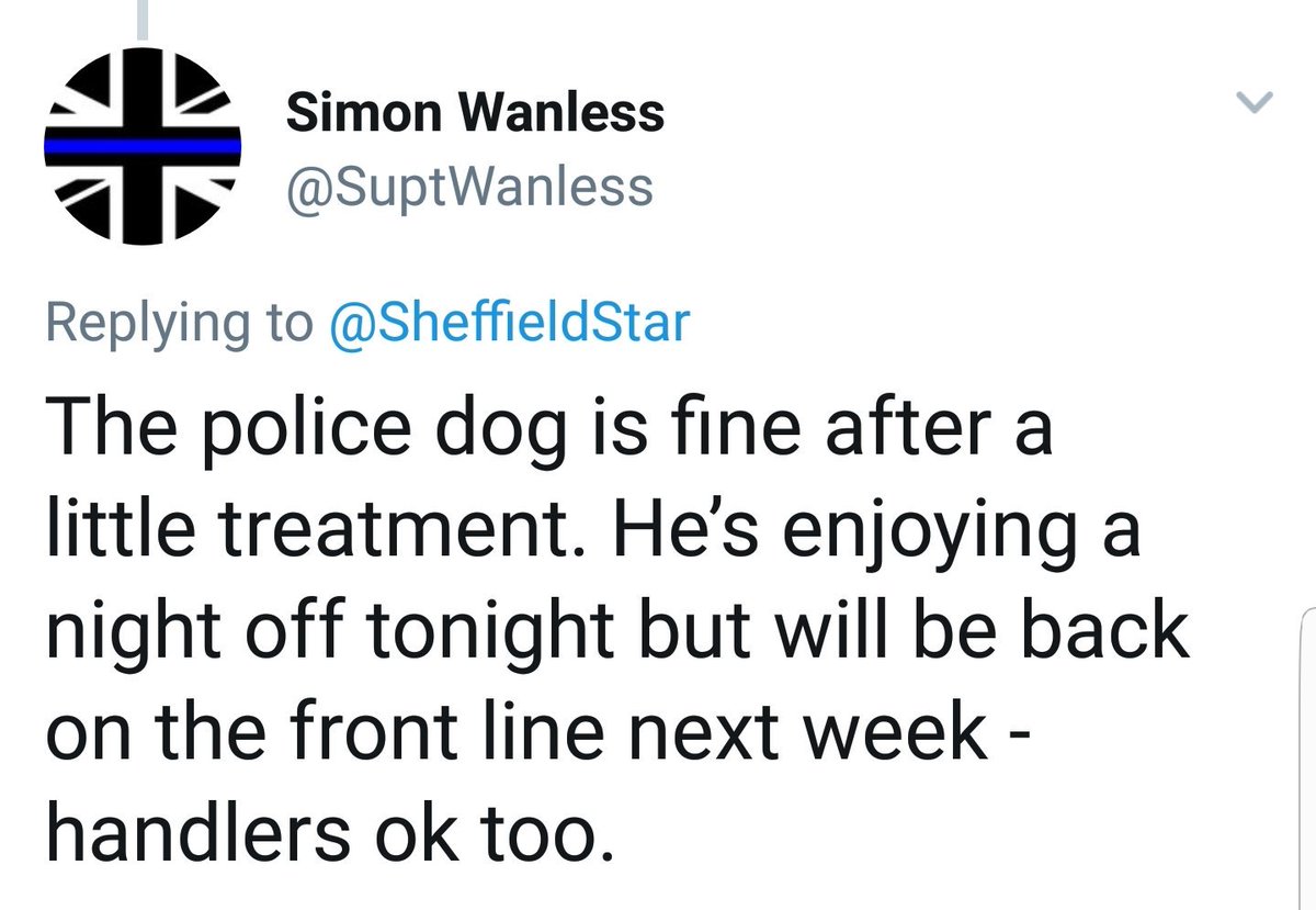 Evening everyone. Regarding the horrible news of another amazing and brave police dog being stabbed today in Sheffield area, here is a brief but positive update. Please RT. Thoughts with the PD, handler and family.