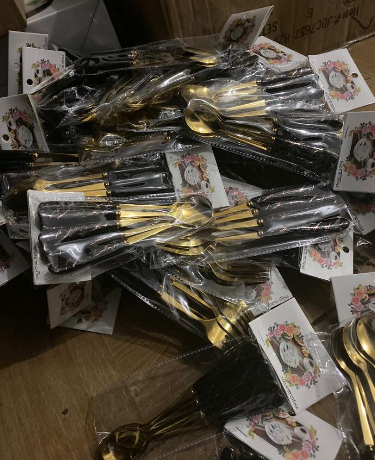 24Pc Black Marble/ Gold Cutlery Set.. Hii set ya watu 6.. * Vijiko vya chai 6 * Vijiko vya Chakula 6 * Visu vya Mezani 6 * Uma 6 75,000/= 0766727272