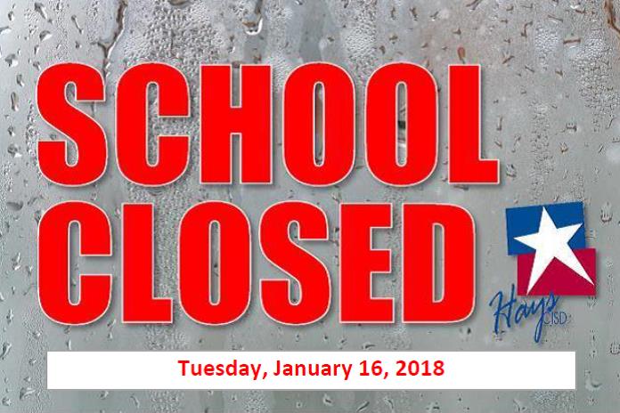 Due to inclement weather, all Hays CISD campuses are closed and activities are canceled on Tuesday, January 16, 2018. For more detailed information about inclement weather planning, please visit http://www.hayscisd.net/weather .pic.twitter.com/YThCK3ZeWd