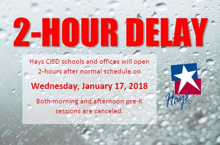 Hays CISD schools and offices are operating on a 2-hour delay on Wed., 01/17/18. All campuses will begin two hours from normal start times. All buses will arrive two hours from normal arrival times. All morning activities are canceled. All pre-K, both AM and PM, are canceled.pic.twitter.com/0ODuiFYg06