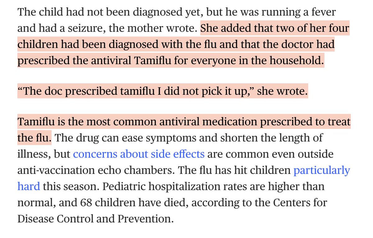 She went and listened to the doctor. The doctor prescribed Tamiflu. The mother didn’t give the tamiflu to the child. The implied message of the article is that the kid died b/c he wasn’t given Tamiflu. A drug that NO RCT EVER has showed to reduce mortality.pic.twitter.com/kbXKIOKlk7