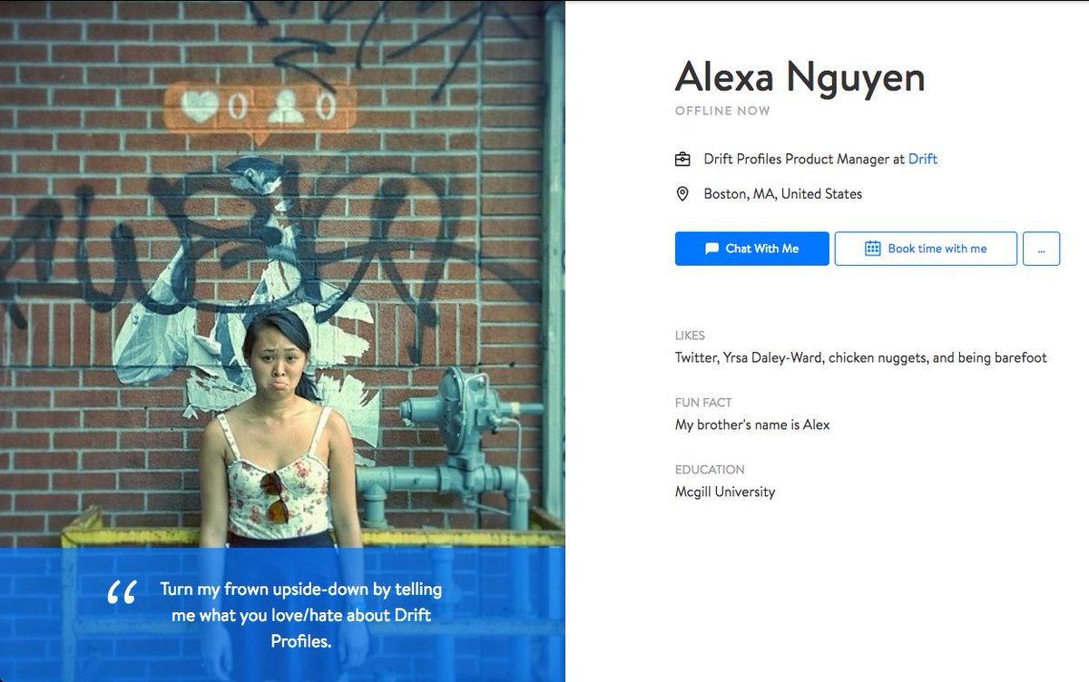 @Drift Profiles (about.me + live chat + scheduling) http://drift.com/profiles We're hungry for feedbackpic.twitter.com/Jwjc0ouTHQ