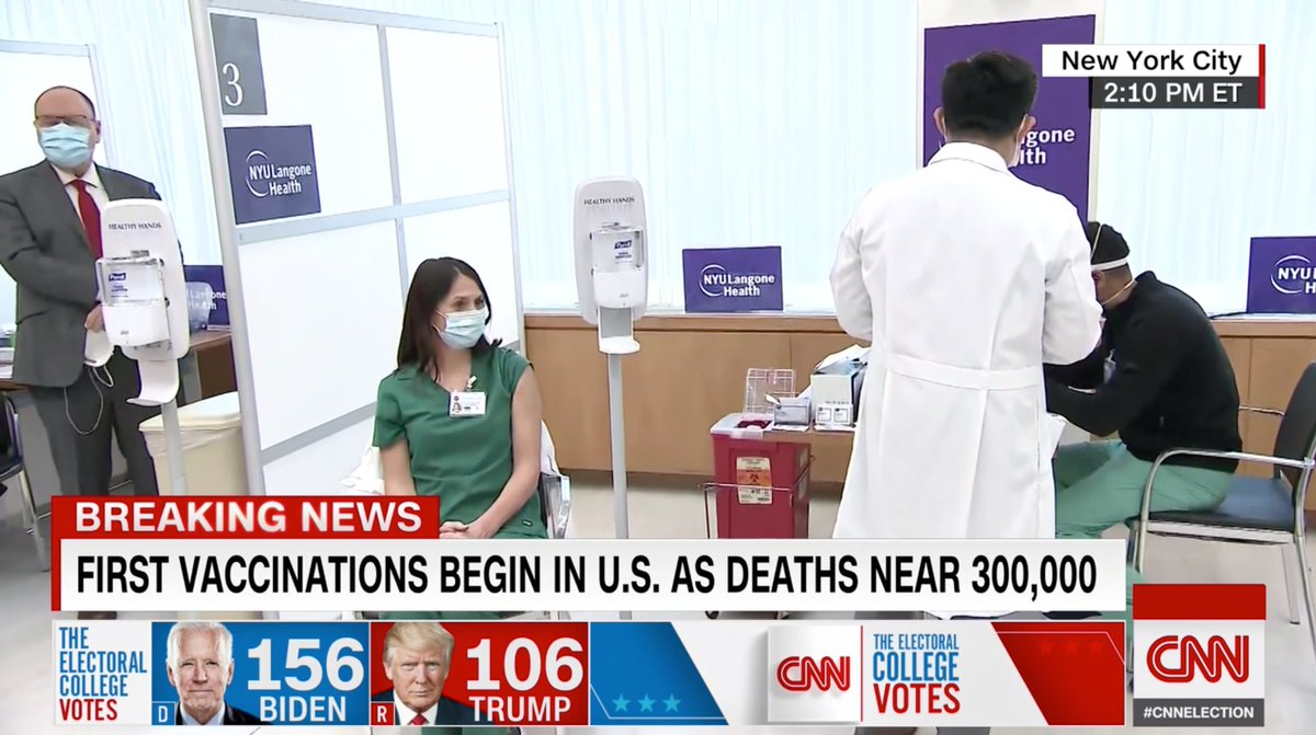 𝐅𝐢𝐫𝐬𝐭 𝐯𝐚𝐜𝐜𝐢𝐧𝐚𝐭𝐢𝐨𝐧𝐬 𝐛𝐞𝐠𝐢𝐧 𝐢𝐧 𝐔.𝐒. 𝐚𝐬 𝐝𝐞𝐚𝐭𝐡𝐬 𝐧𝐞𝐚𝐫 𝟑𝟎𝟎,𝟎𝟎𝟎 This image and this chyron. What a year. "There is a light at the end of the tunnel,"