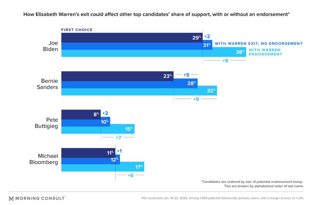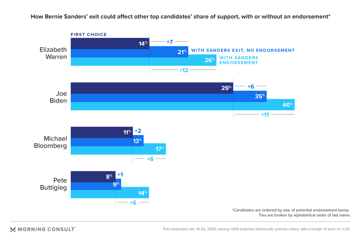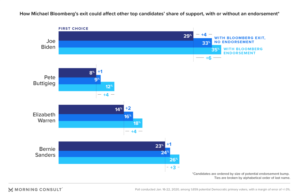 New from me: At some point in the coming weeks, a top Democratic contender *should* drop out of the presidential race, if past is precedent. A look at the impact their exit, and endorsement, could have on the remaining contenders' first-choice support. https://morningconsult.com/2020/01/30/how-endorsements-could-shape-a-narrowing-democratic-presidential-field/ …pic.twitter.com/yZqNZcUGSM