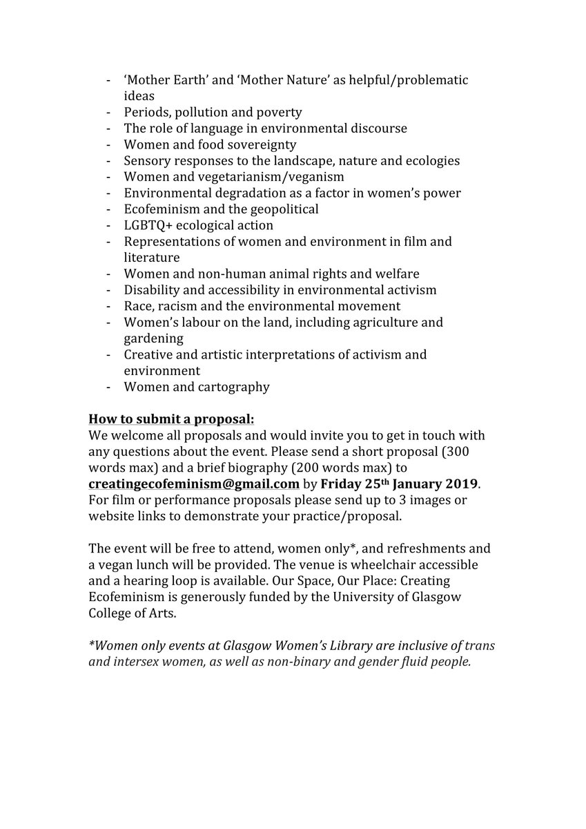 Mark your calendars: the deadline for proposals for "Our Space, Our Place: Creating Ecofeminism"