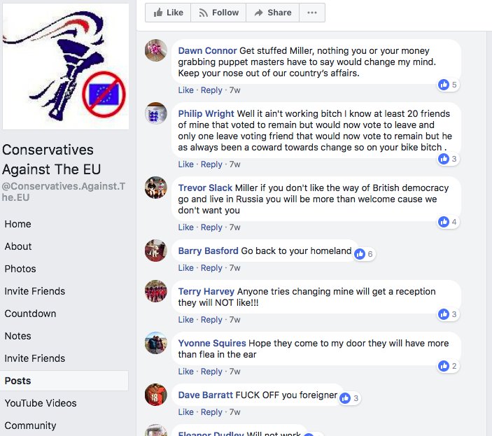 Are you ready for some "investigative journalism"? I went on Facebook, searched Conservatives, clicked on a page, looked at the second post down about Gina Miller, found misogyny, abuse, an implied threat of violence & implicit racism. When do I collect my Pulitzer?pic.twitter.com/WFQJqAXDBq