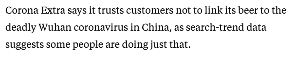 Imagine dedicating yourself to studying the fundamentals of mass comm, toiling your way up the PR industry. Then being tasked with crafting this message...https://www.insider.com/corona-beer-virus-wuhan-no-link-trusts-customers-2020-1 …