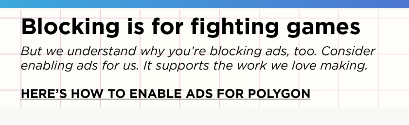 Shoutout to @Polygon for just being upfront about AdBlock and asking users nicely to whitelist, rather than some sites that just don't even let you access if you have AdBlock enabled.pic.twitter.com/9goG0cat8V