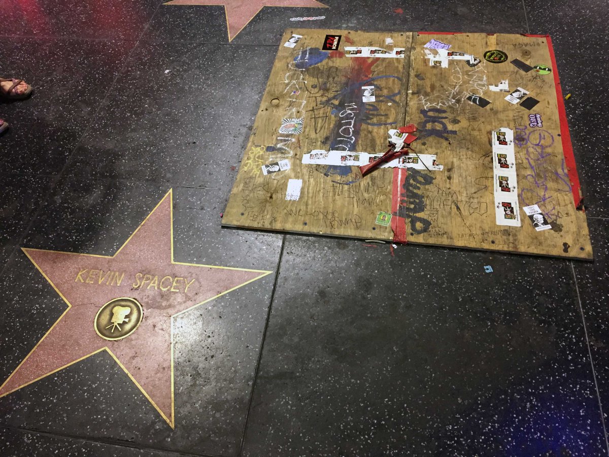 #hollywoodwalkoffame@realDonaldTrump's star has been covered with plywood, secured by screws into the pavement, to protect it from vandals. It holds an honored position next to#KevinSpacey.pic.twitter.com/ne4uZmqHK8