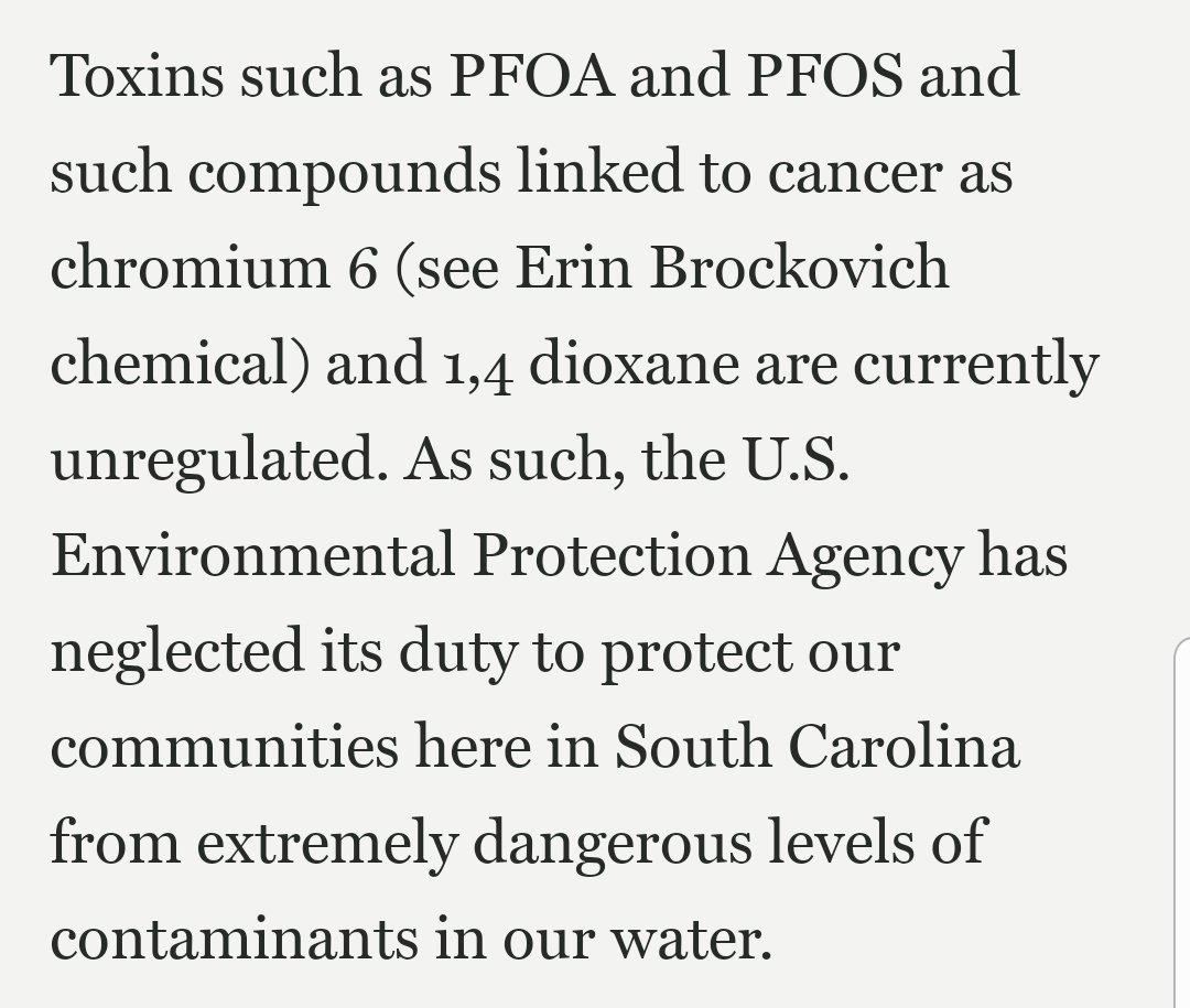 We need to keep fighters like JA in office working for us! No one should be exposed to these chemicals in their drinking water! Our government needs to do a better job of protecting it's citizenry.https://jamooreforsc.com/