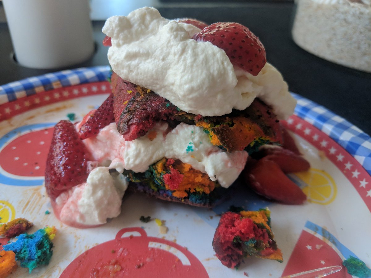 In today's thrilling conclusion of yesterday's shortcake: Strawberries got tossed with some sugar, and cream was whipped. It's a hit at the Pride BBQ my good friend is holding.