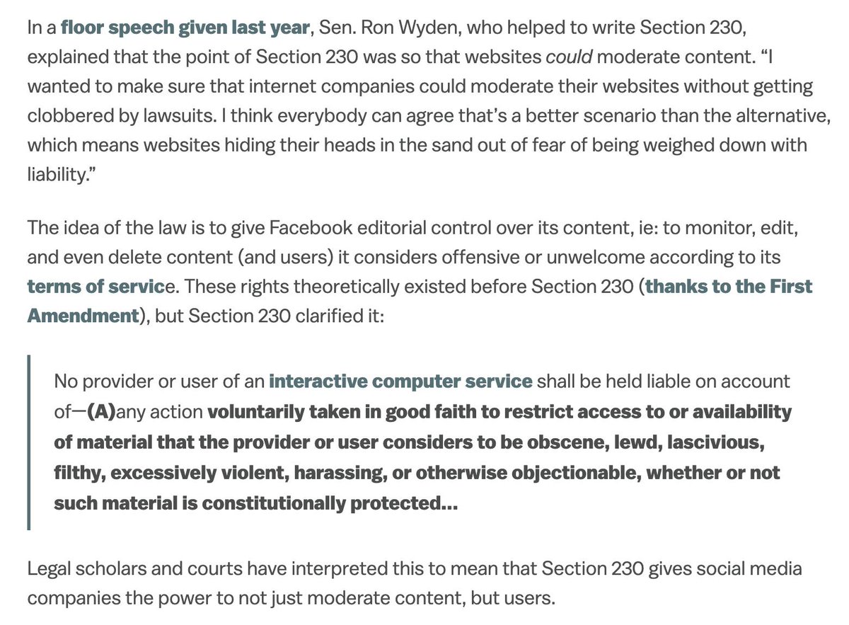 In short: Section 230 protects Facebook and its ability to moderate content and users. There’s no “neutrality” requirement — the difference isn’t between publisher and platform, but between ‘your content’ and ‘content made by Facebook'pic.twitter.com/nSO2SO21eR