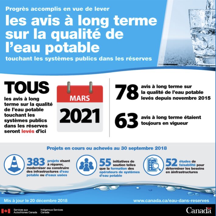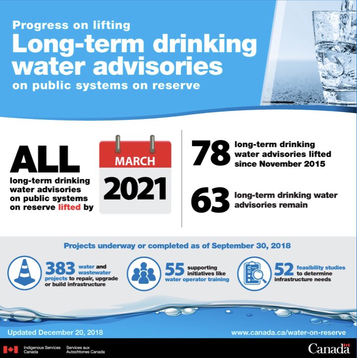 7 long-term drinking water advisories on public systems on reserve have been lifted in #Manitoba since 2015, and our work continues to lift the 4 remaining. We’re continuing on our commitment to lift all long-term advisories on public systems on reserve by March 2021. /2pic.twitter.com/85Bq5m7PUw