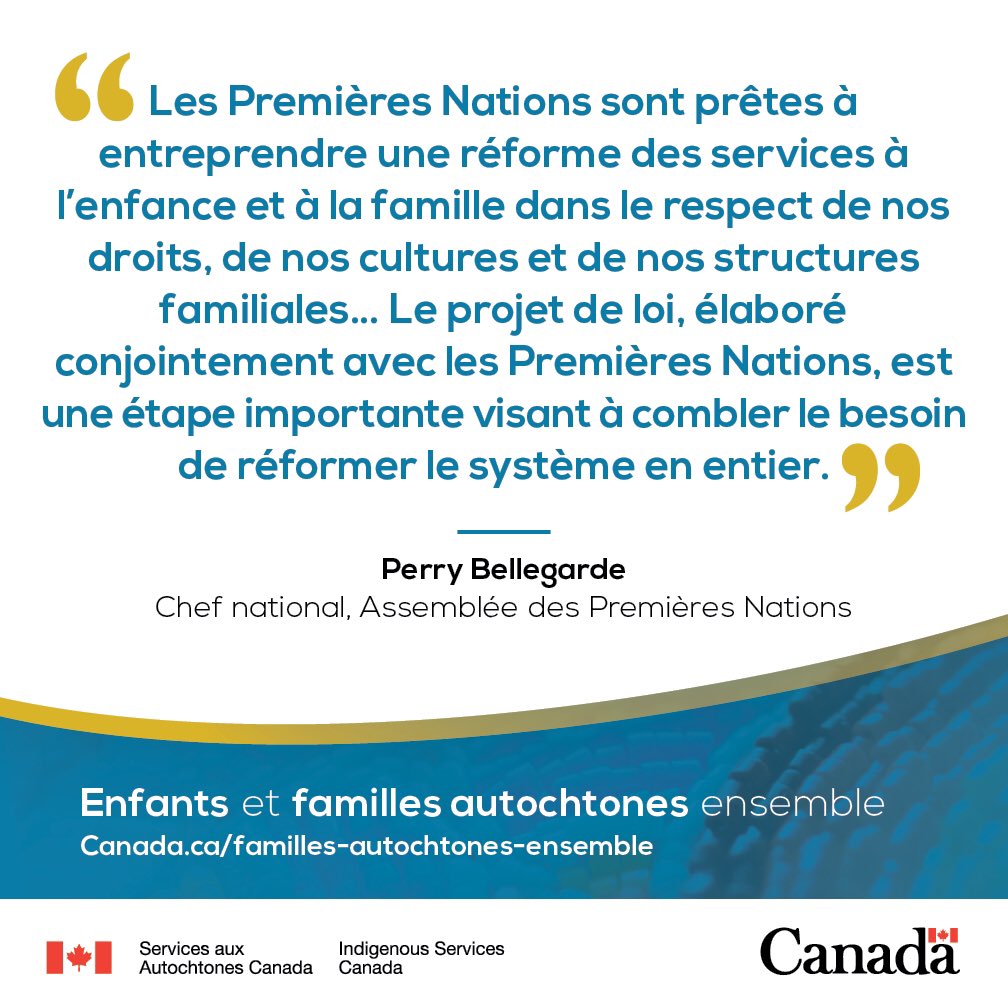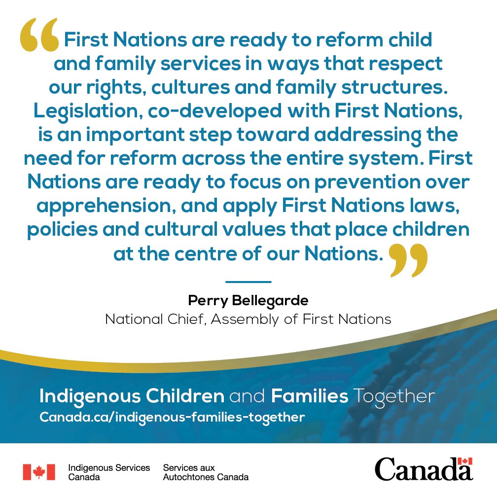 « Les Première Nations sont prêtes à mettre l’accent sur la prévention plutôt que sur la prise en charge par l’État, et à appliquer leurs lois, leurs politiques et leurs valeurs culturelles, qui placent les enfants au centre de nos nations. »