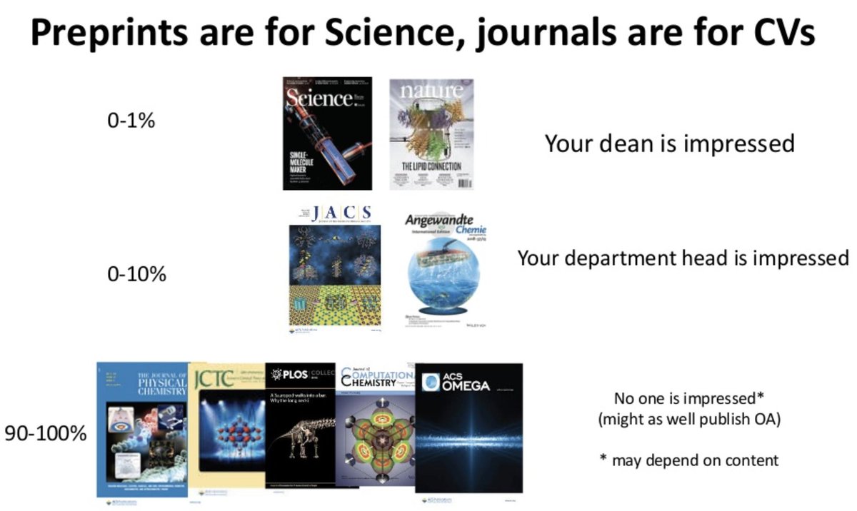 @janhjensen says it best "Preprints are for science, journals are for CVs" and then classifies journals into 3 categories: (i) those the dean cares about, (ii) those the department head cares about, (iii) the resthttps://twitter.com/LindorffLarsen/status/1102218135082598401?s=20 …