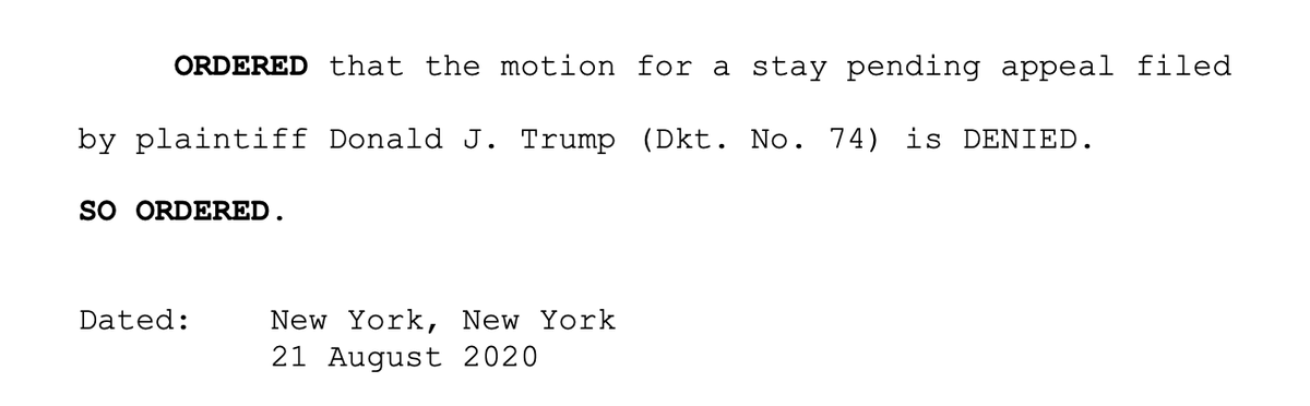 In Trump's tax return case in New York, the judge today denied a temporary stay of his judgement pending an appeal.pic.twitter.com/pcvCuyqcMA