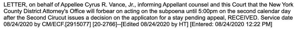 NEW: Manhattan DA tells Trump's legal team that they would not enforce the subpoena until 2 days after 2nd Circuit rules on Trump's stay application.pic.twitter.com/KbGd1w8L9u