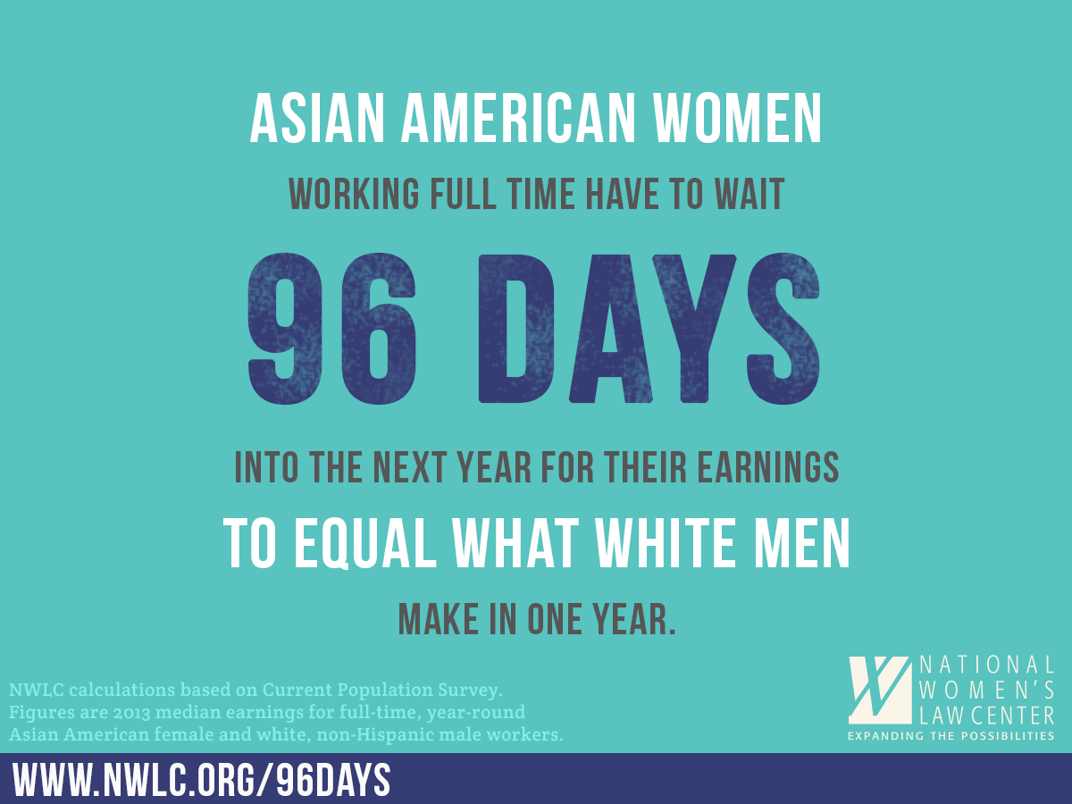 Asian American women are typically paid 79¢ for every $1 paid to white men: http://nwlc.org/96days  #EqualPayNowpic.twitter.com/SysnuOyJCr
