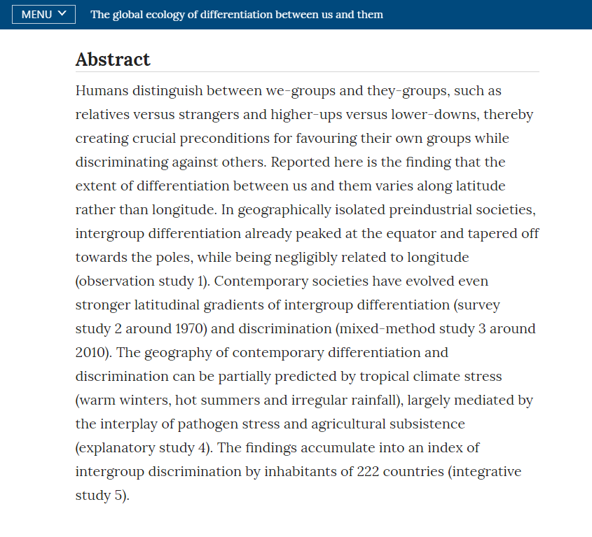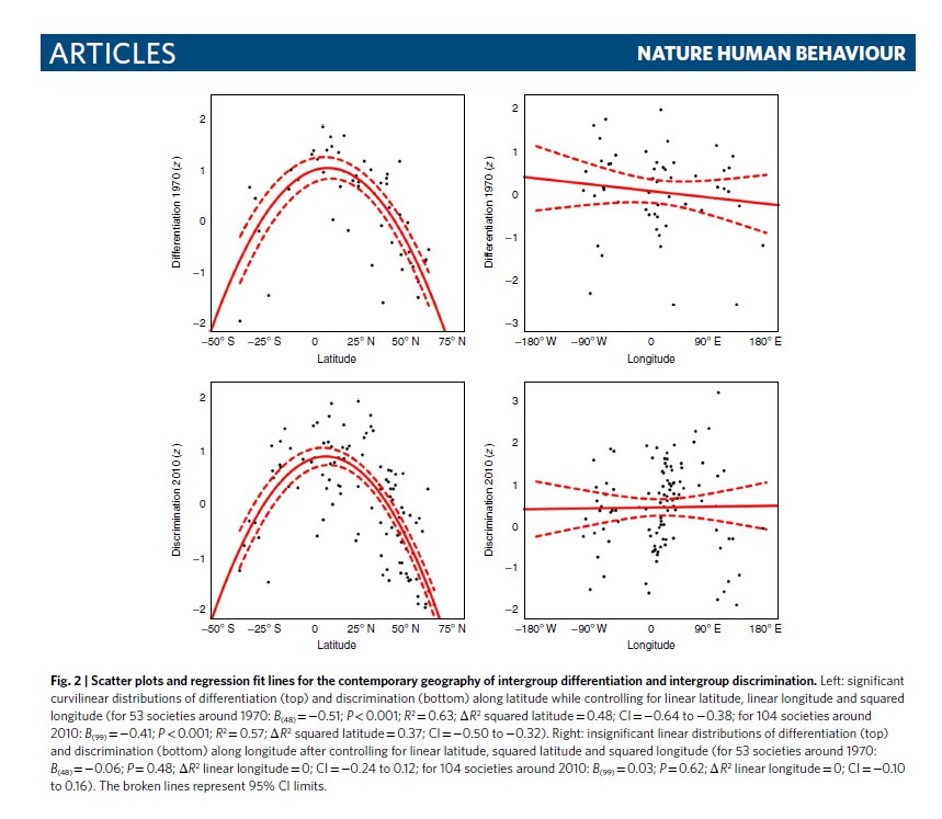 @NatureHumBehav reports latitudinal gradients in intergroup differentiation between us and them. The findings show that intergroup differentiation and discrimination peak at the equator and decrease with distance from the equator. https://doi.org/10.1038/s41562-019-0783-3 …pic.twitter.com/9BRr9lk8DK