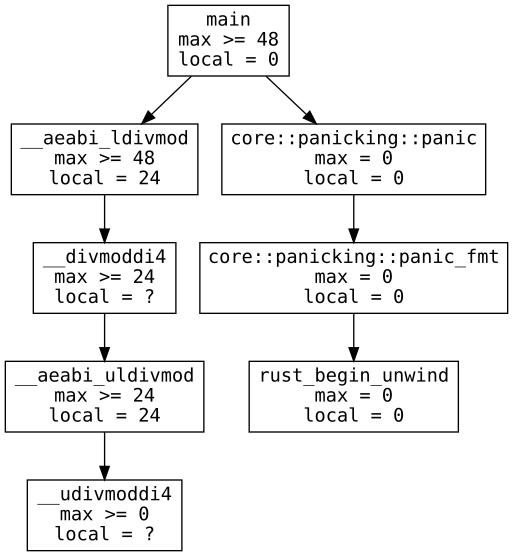 Also, the tool now extracts even more call graph information from (ARM Cortex-M) machine code (i.e. it searches for jump instructions in it) This is particularly useful when dealing with programs that call into external C code or into the compiler-builtins crate 2/3pic.twitter.com/Gpm1kubra7