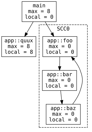 Cycles? No problem The tool will analyze call graphs that contain cycles (i.e. recursion) instead of giving up. It may not always be possible to upper bound the stack usage though! Here's an example where an upper bound can be computed 4/8pic.twitter.com/PGEz2t9HM4