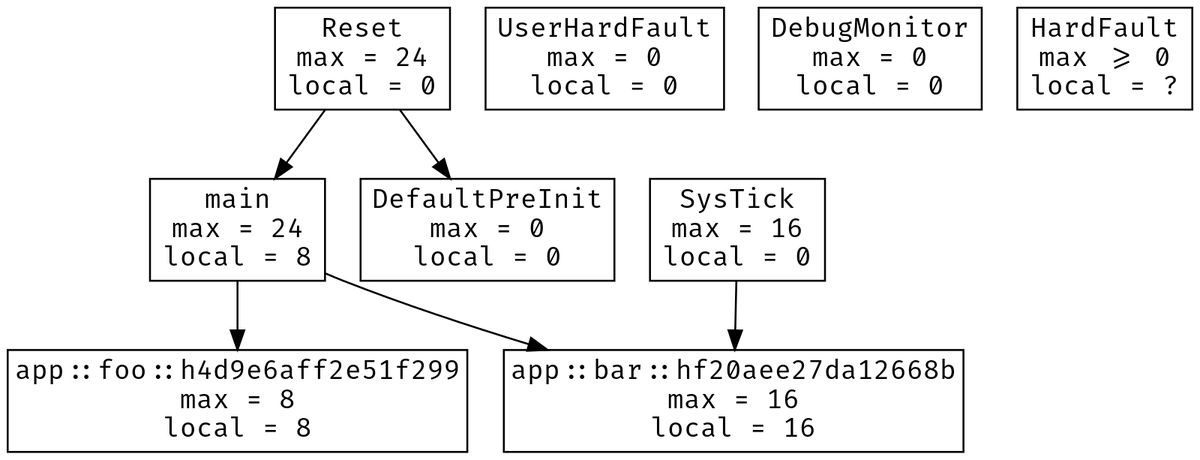 The biggest change is that the user no longer needs linker script magic to preserve the `.stack_sizes` section. Run the tool on "Hello, world" and the graph will contain stack info!