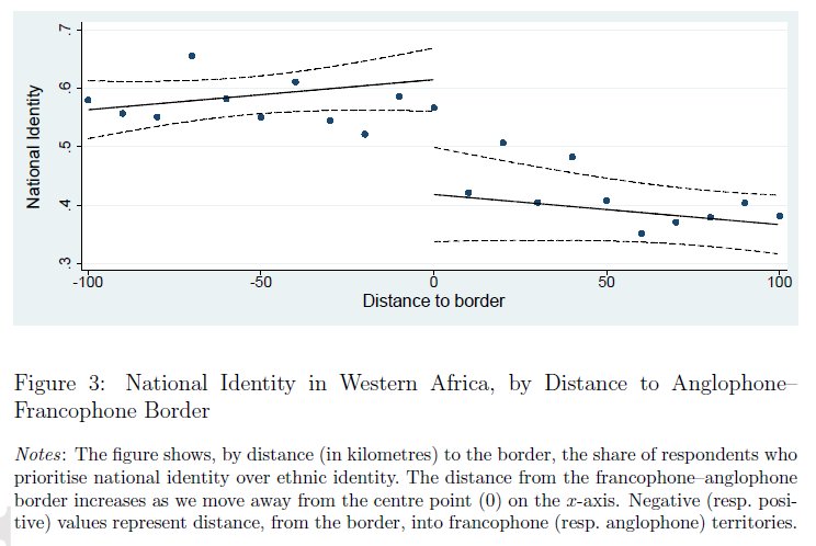2) Ali et al.: Colonial Legacy, State-building and the Salience of Ethnicity in Sub-Saharan Africa Punchline: Weaker state capacity, national identity in anglophone relative to francophone countries in Africa (and yes, endogeneity is addressed!) http://onlinelibrary.wiley.com/doi/10.1111/ecoj.12595/full …pic.twitter.com/xJSPlHDRyK