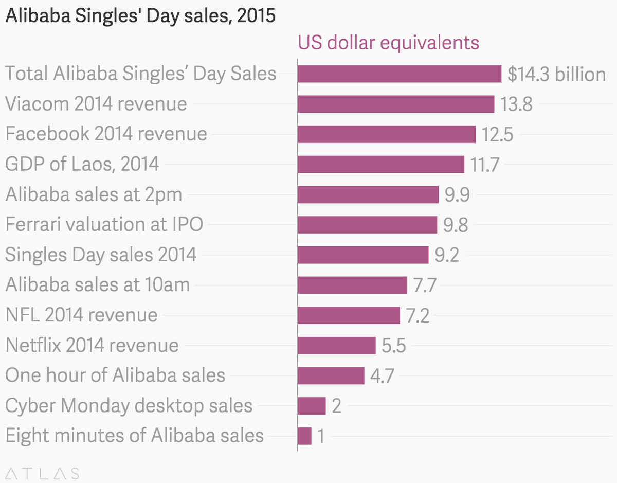 Alibaba's Singles' Day shopping total was bigger than Facebook's revenue last year http://bit.ly/1llzbVU pic.twitter.com/M2VWvBUUdz