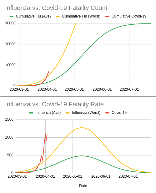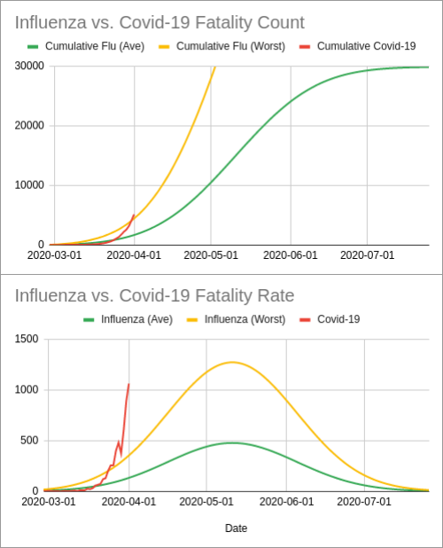 #justtheflu people and those complaining about#30moredays, here is a graph of an "average" flu year and the worst flu year in the past decade put together with#covid19#coronavirus deaths so far.#StayAtHome