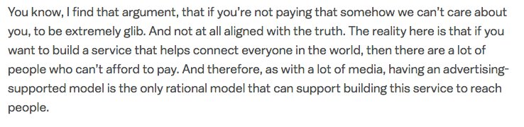 !!! I can't believe Facebook is doubling down here (Zuck already said this to @kevinroose). You have $20B profit, 50% margins, biz model isn't binary: full surveillance or subscriptions. many options to protect consumers better. ht @ezraklein @mikeallen https://www.vox.com/2018/4/2/17185052/mark-zuckerberg-facebook-interview-fake-news-bots-cambridge …pic.twitter.com/N77LbZrONs