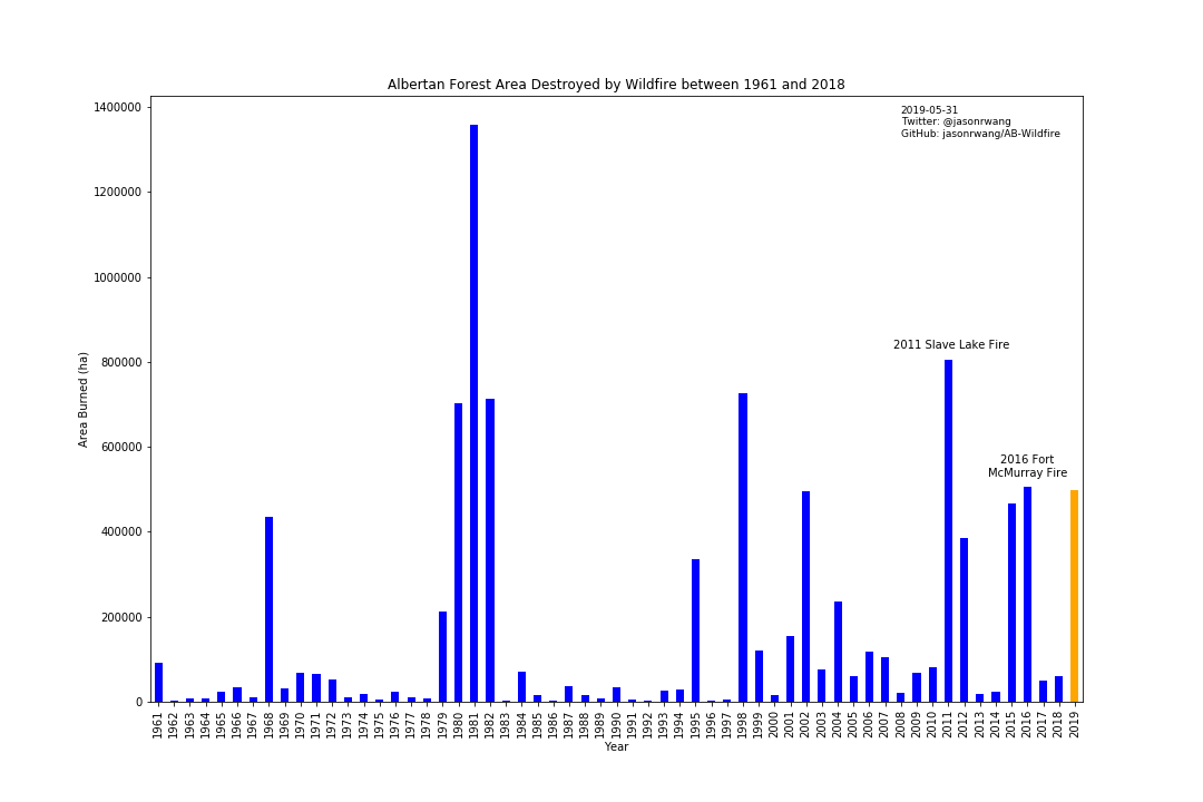 Note two other large limitations to this data viz: 1. This implies Albertans do not see impacts from forest fires in other provinces. Fact: they do. Not pictured here is 2017 and 2018's BC wildfires, which turned Alberta quite orange.