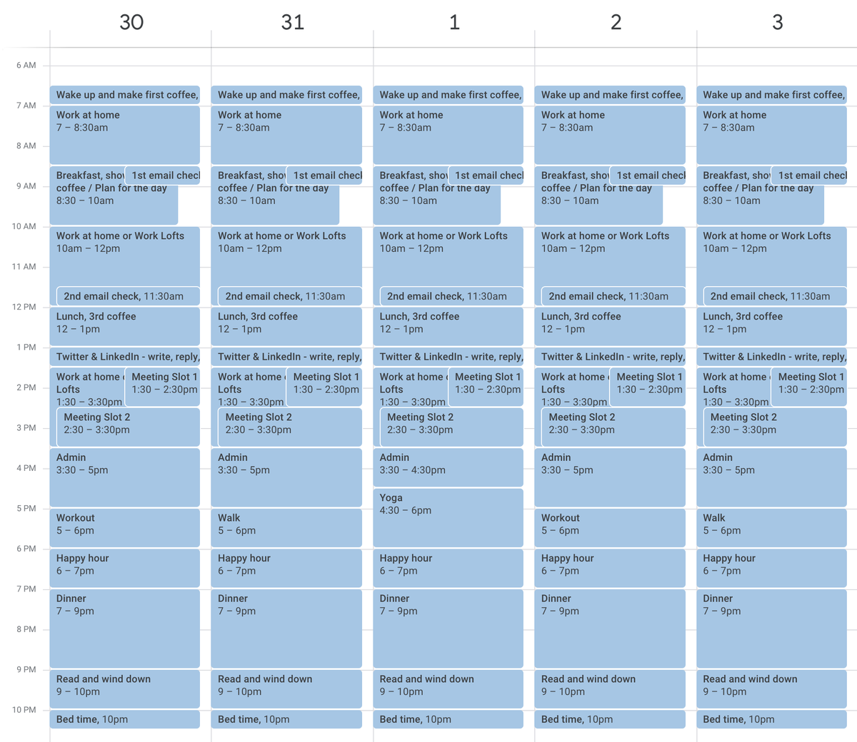 After years of designing my days, I realized that most days, I do the same things at the same times. So instead of starting from scratch every morning, I created a calendar template that contains all the building blocks of my ideal day. http://ed.gr/cbqvu pic.twitter.com/7qfkvbuhko