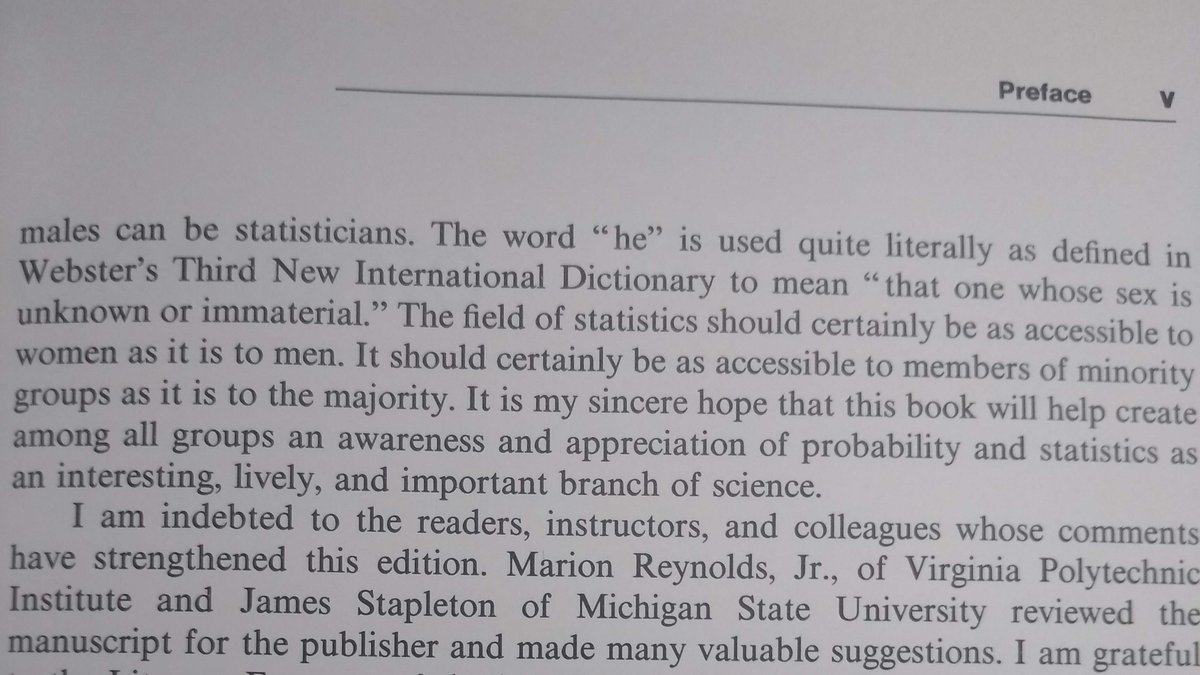 It really puts a smile on my face to see that this was written in the preface of a STEM-related book in 1985. Well done Prof. Morris H. DeGroot! (Probability and Statistics, 2nd Edition)pic.twitter.com/JgPKsNMqv6