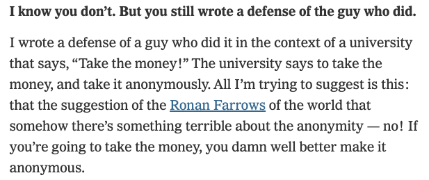 (And note the story gets into all this nuance! 4th graf: "He argued that in an ideal world, no institution should take money from people like Mr. Epstein, but that in reality, much of the money that props up universities and other elite institutions comes from troubling sources")