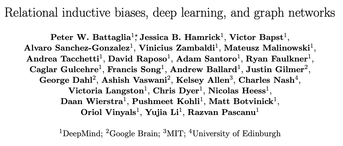 i just read this excellent paper from 2018: "Relational inductive biases, deep learning, and graph networks". extremely well written, very clear, excellent graphics, and with code. highly recommended! paper: https://arxiv.org/abs/1806.01261 code: : http://github.com/deepmind/graph_nets …pic.twitter.com/qxqLFVqIVk
