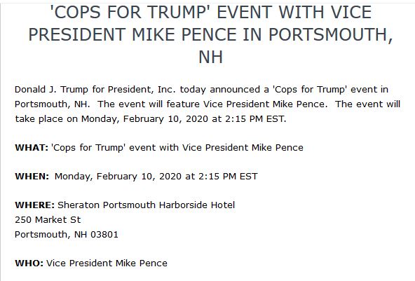 @WMUR9 reported VP@Mike_Pence will be in NH 2/10 ahead of@realDonaldTrump rally in Manchester. Announcement just in for "Cops for Trump" event, featuring Pence, 2:15 pm 2/10 at Sheraton in Portsmouth.#fitn#nhpolitics#WMUR https://www.wmur.com/article/its-confirmed-trump-to-lead-rally-with-supporters-on-primary-eve-in-manchester/30647874 …pic.twitter.com/8GV47TlVa2