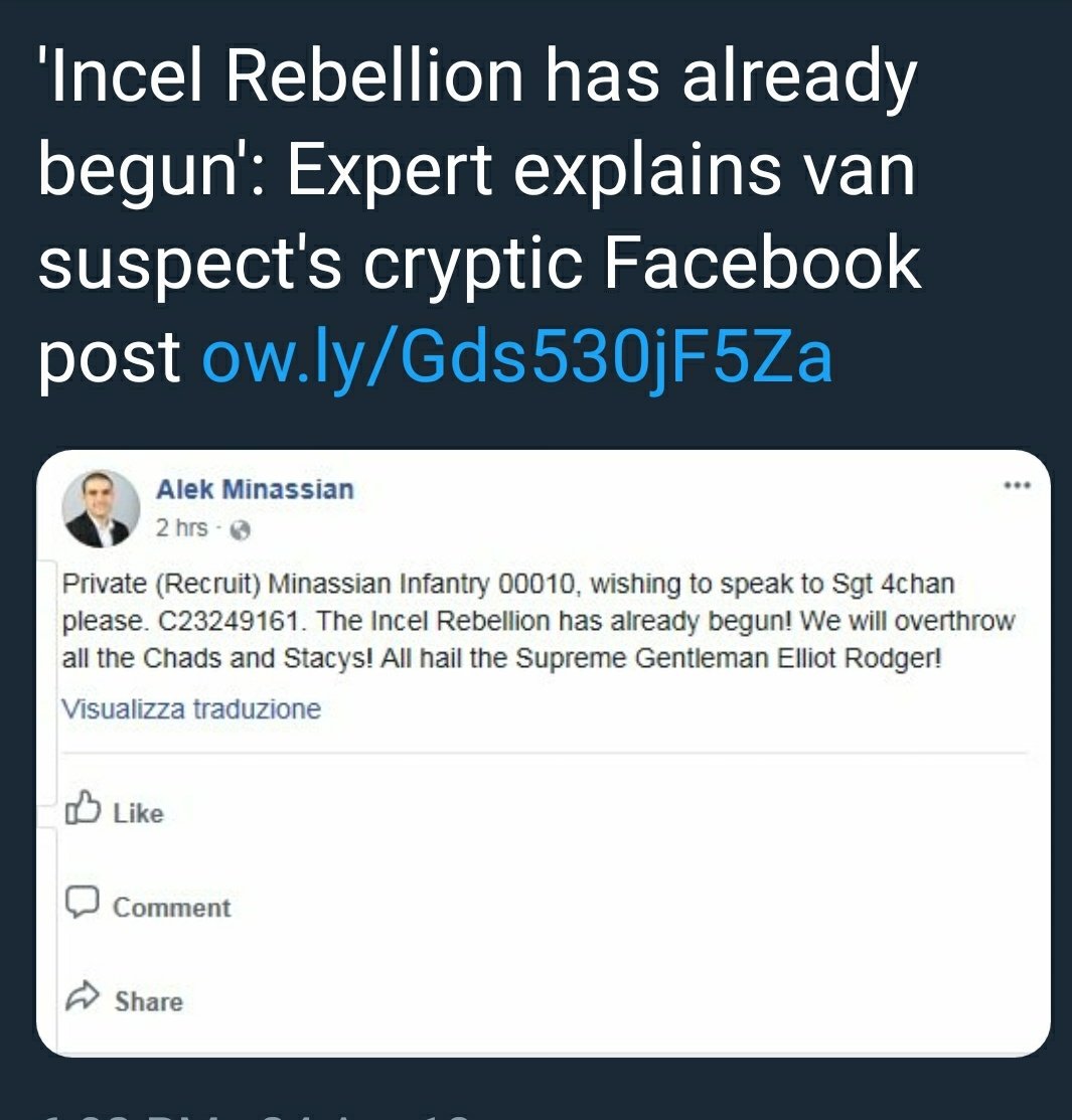 Tell that to the ppl that were terrorized in the streets of Toronto yesterday.. But wait... Wasn't Muslim.. So it couldn't be terrorist attack, right? Just some crazy lunatic killing ppl, nothing to fear folks.. Just look away