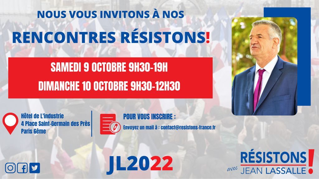 @ResistonsFrance les 9 & 10 oct. Appel à la mobilisation générale, ateliers de travail.. Chacun peut contribuer à notre projet collectif, préparé par des hommes & des femmes de terrain, bien ancrés dans nos territoires#JeanLassalle2022#Francedesterritoirespic.twitter.com/AODNmZEy50