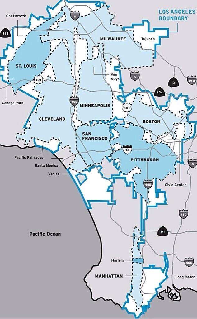 LA so big! SF, Manhattan, Boston, Pittsburgh, Cleveland, St. Louis can all fit inside LA city limits!